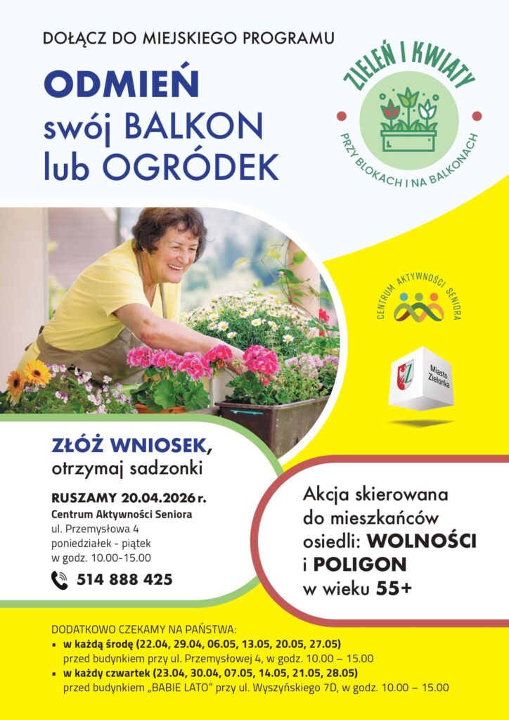 Program „Zieleń i kwiaty przy blokach i na balkonach” ma na celu aktywizację mieszkańców w wieku 55+ poprzez zaangażowanie w prace ogrodnicze oraz poprawę estetyki balkonów. Program ma charakter lokalnego programu aktywizacji społecznej i estetyzacji przestrzeni zamieszkania i obejmuje mieszkańców osiedla Wolności i Poligon w Zielonce.